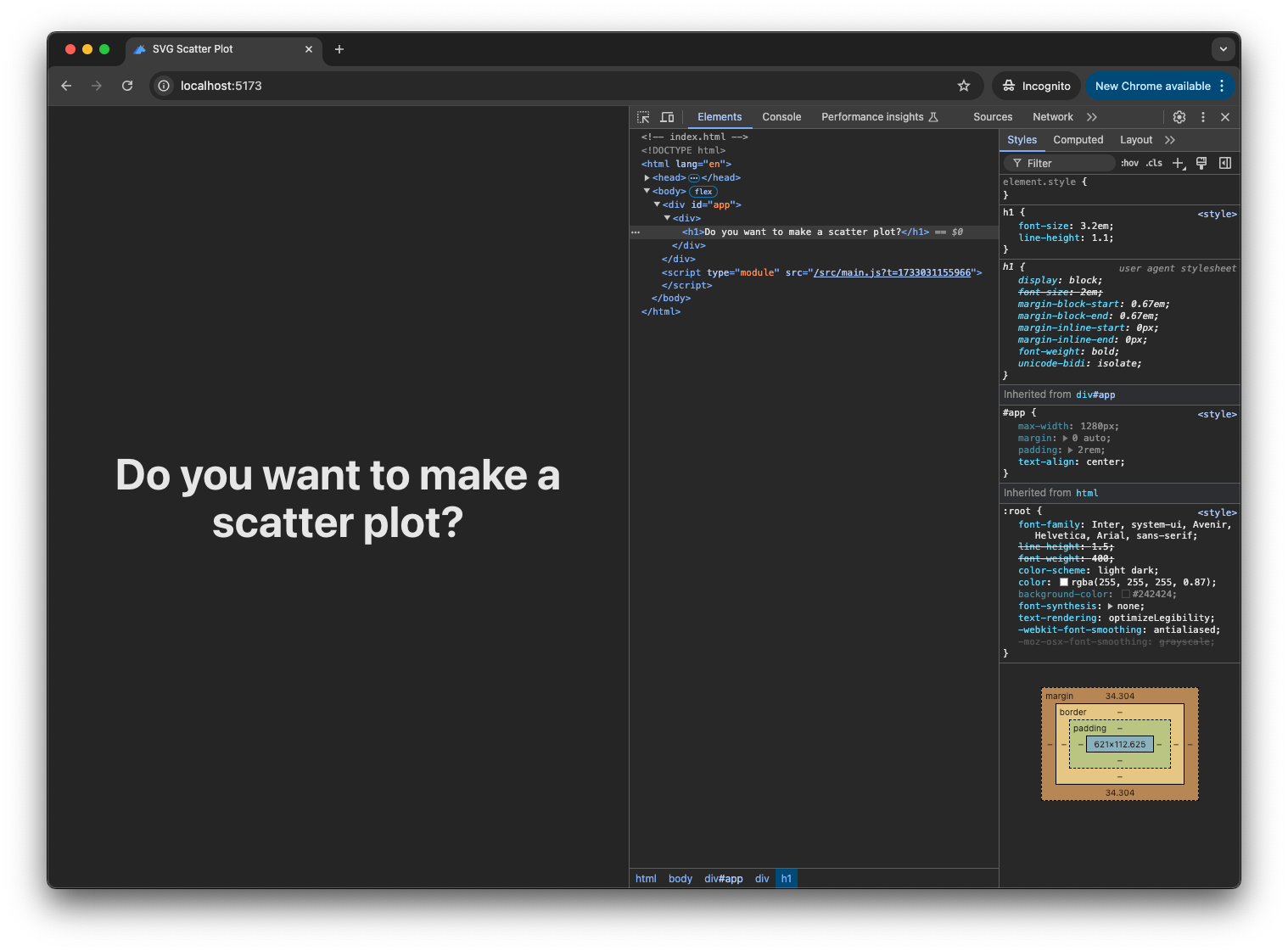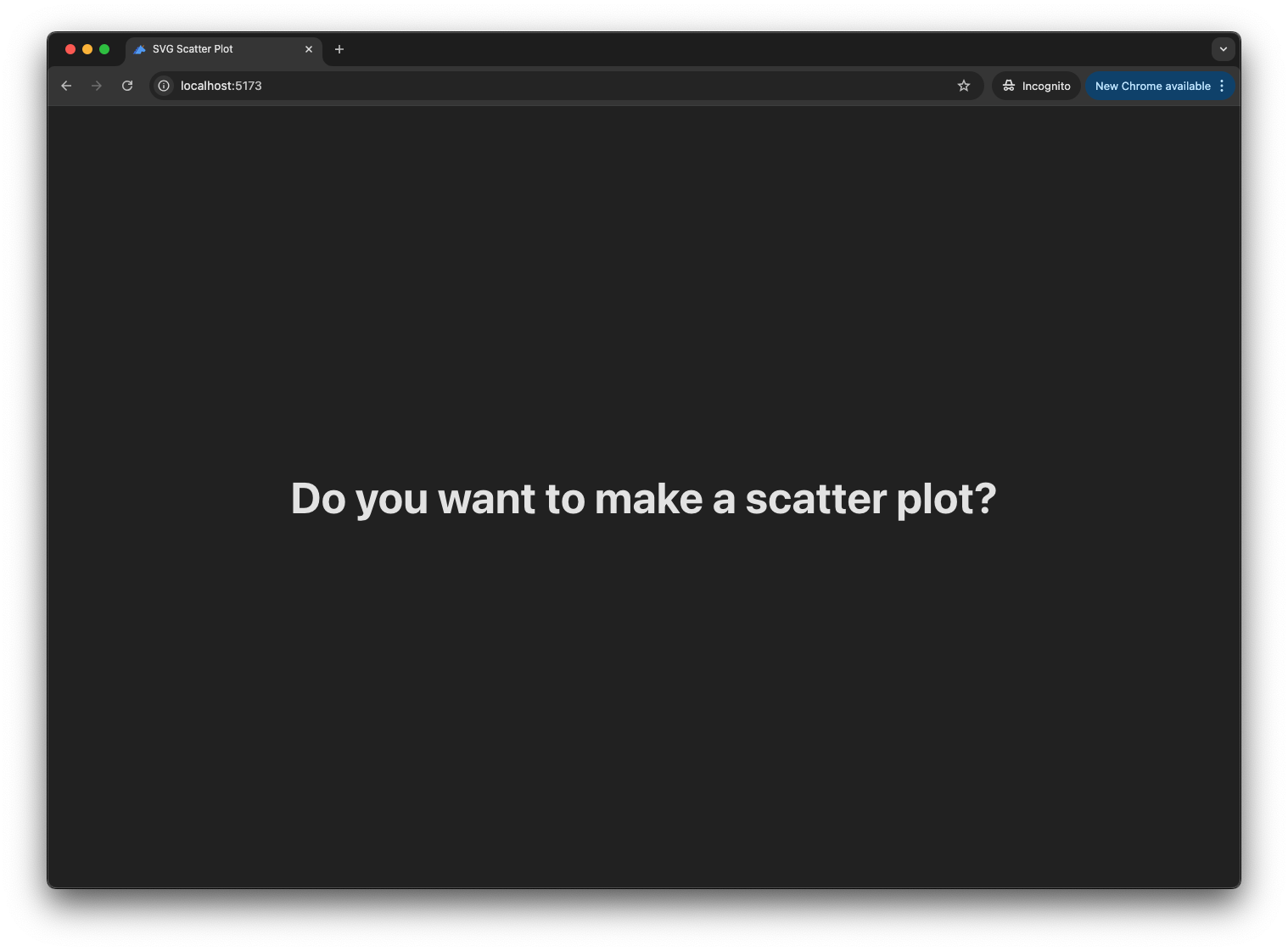 This will look very similar to index.html, except you can recognize that the "Do you want to make a scatter plot?" text is coming from main.js. We are manipulating the DOM using JavaScript!