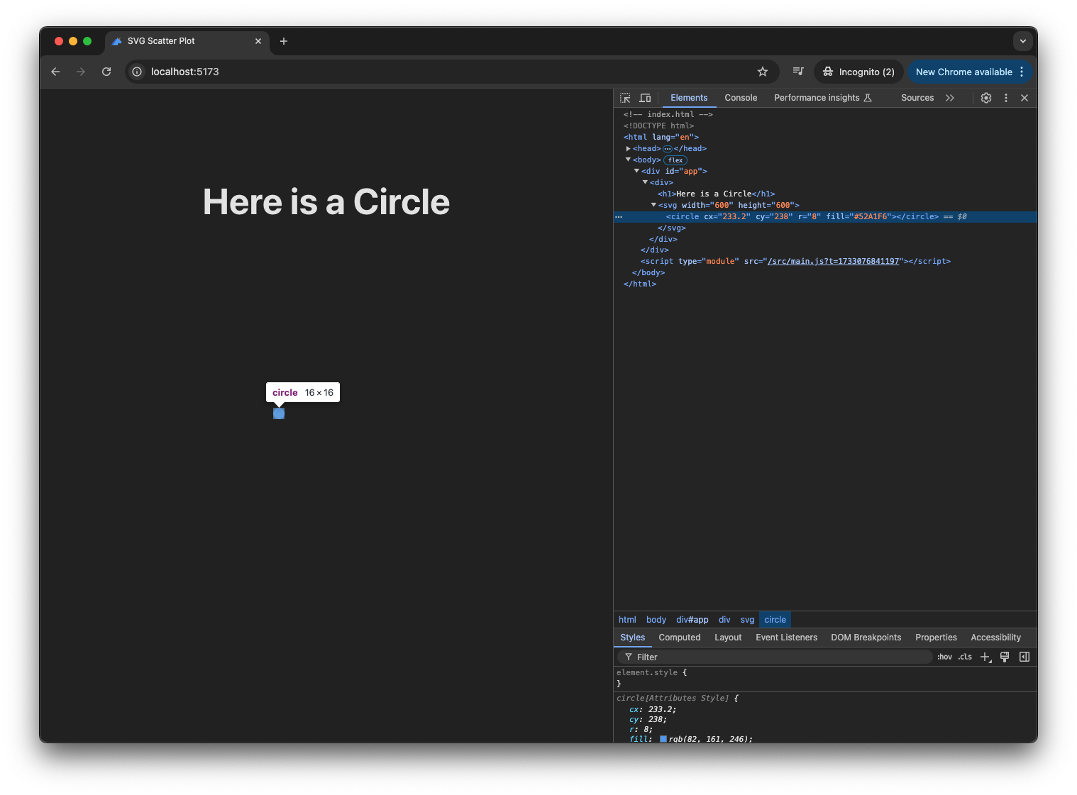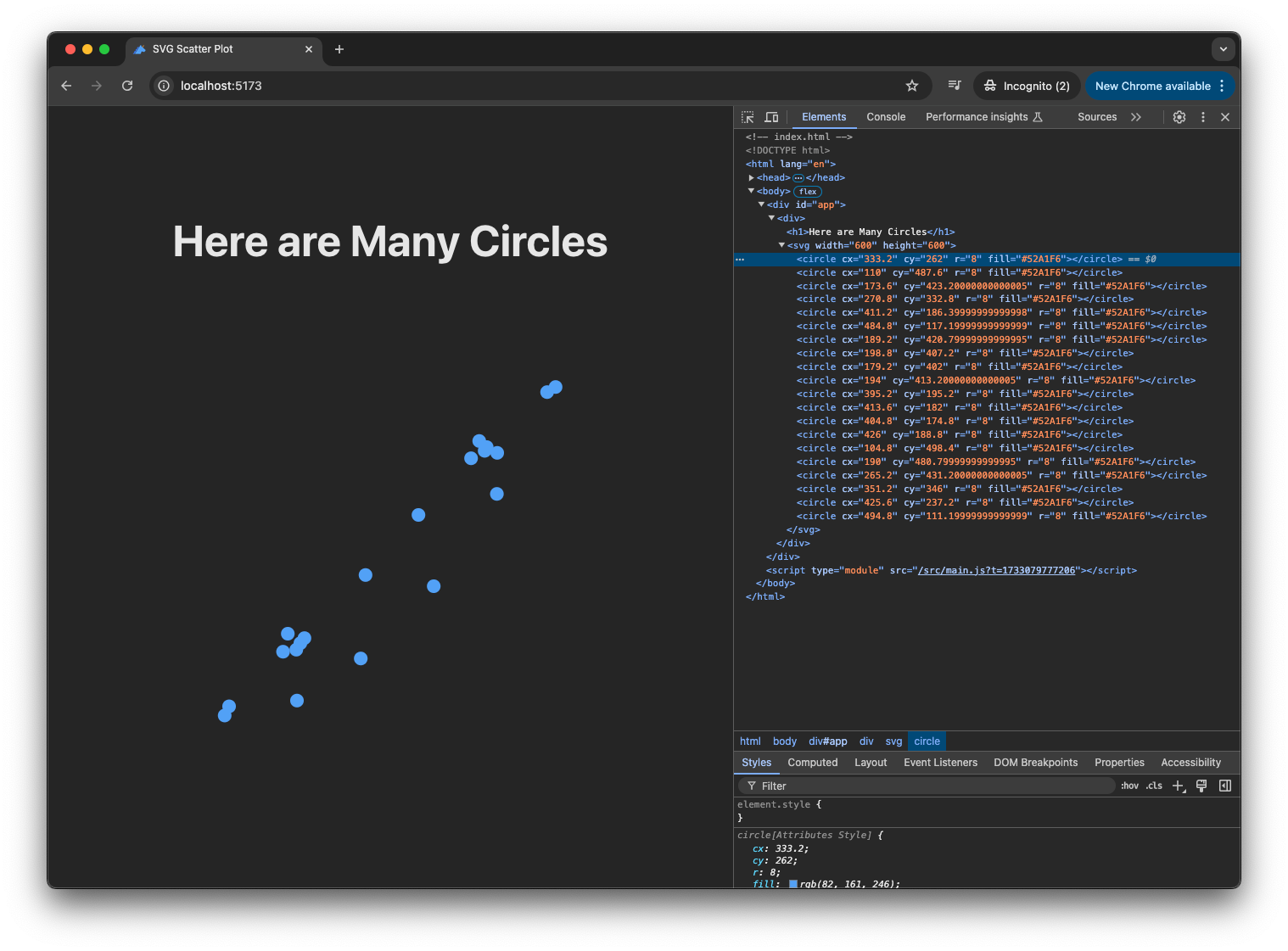 <script src="https://d3js.org/d3.v7.min.js"></script>Now, in main.js, we can create a function to generate the same scatter plot with D3:
