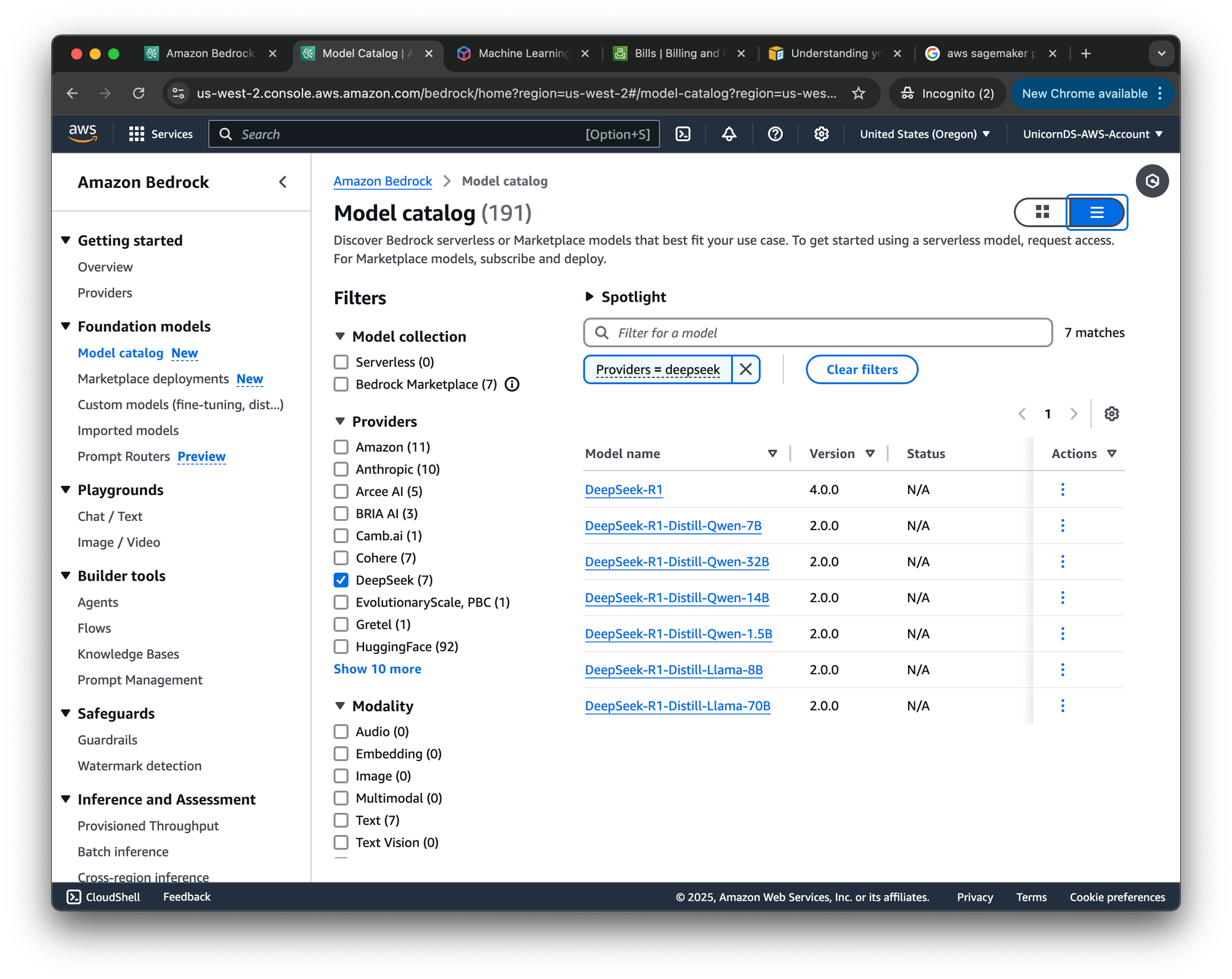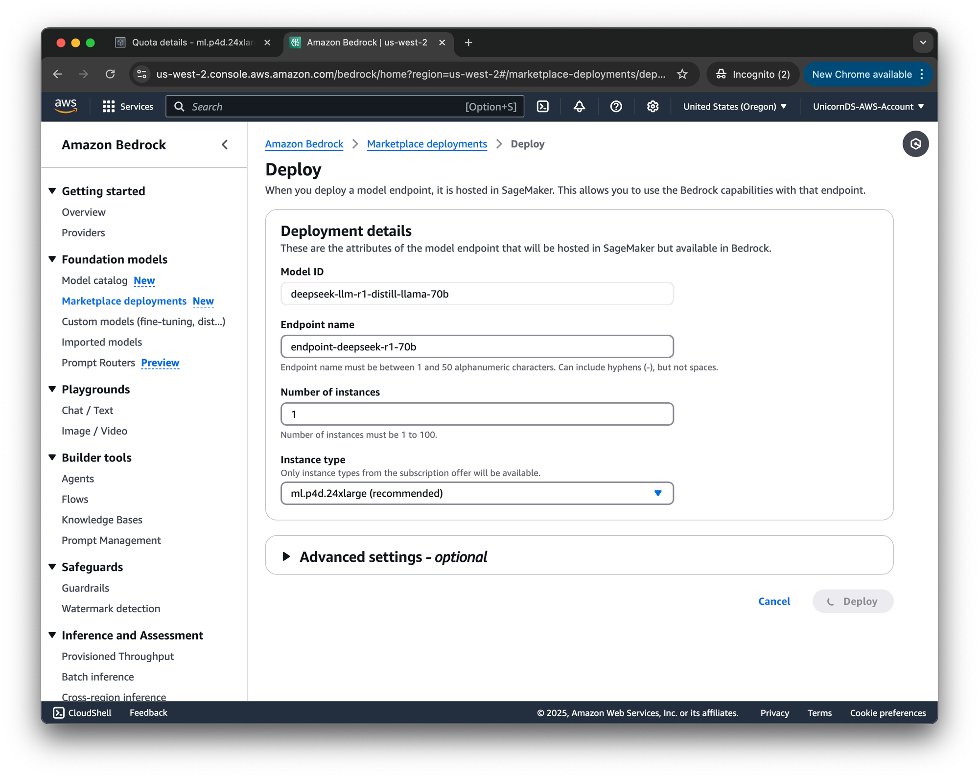 Once I got the ml.p4d.24xlarge instance quota, setting up DeepSeek from Bedrock marketplace deployment was such a breeze. Given the size of the 70B model, I was expecting to wait a while for deployment to be done. But the model was ready within minutes.
