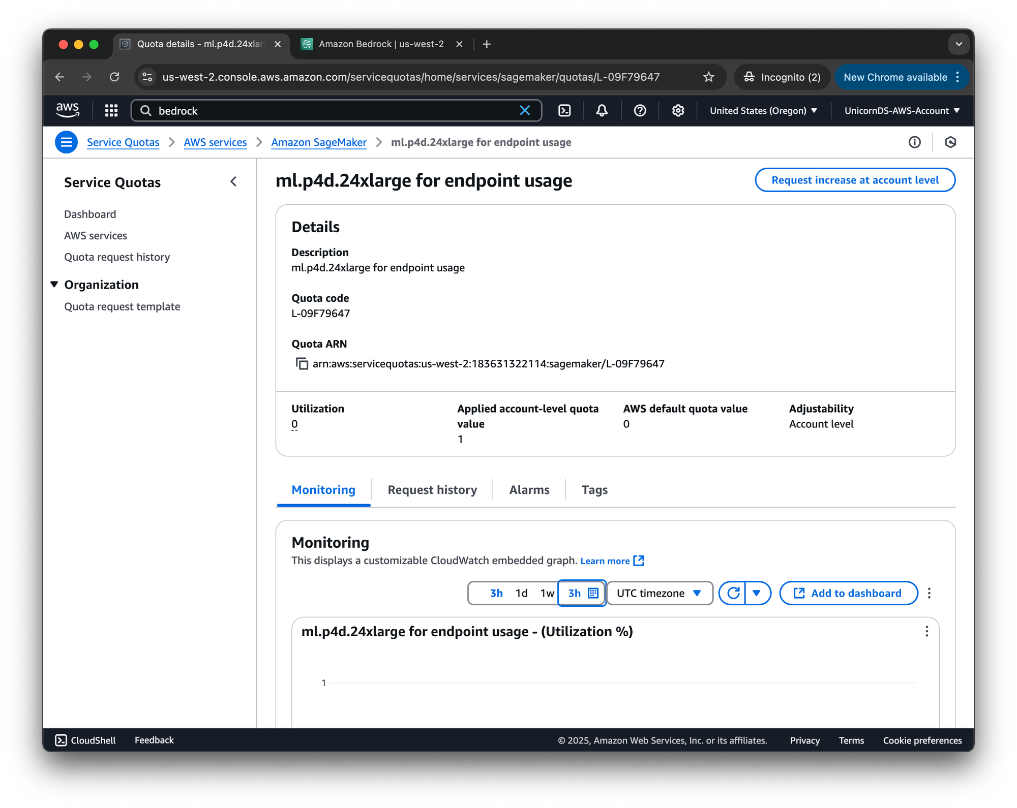 ml.p4d.24xlarge endpoint usage (the recommended instance). This can take some time, especially if you have a new AWS account. But it's a very powerful resource!Initially I requested quota increase for the ml.p5e.48xlarge instance, as described in the original instruction. After a couple of weeks, my request was approved, but the supported instances for marketplace deployments have since been updated. So I requested ml.p4d.24xlarge. The second request was approve quickly, within days.