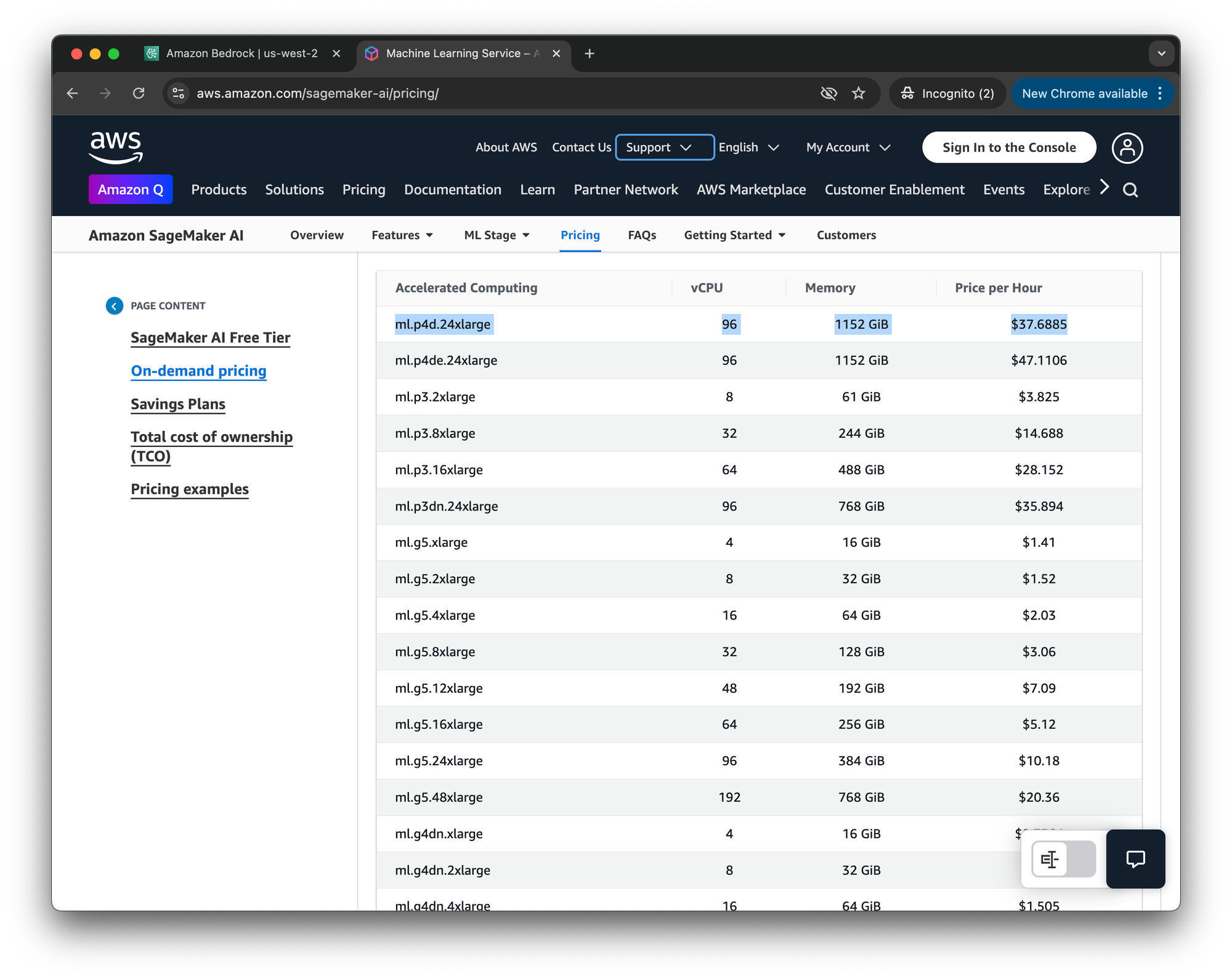 If you do try out Bedrock Marketplace Deployment, don't forget to turn off your instance after you are done! Before turning on an AWS resource, it's always a good idea to check out the pricing page. The ml.p4d.24xlarge instance is very powerful, and its price reflects that!