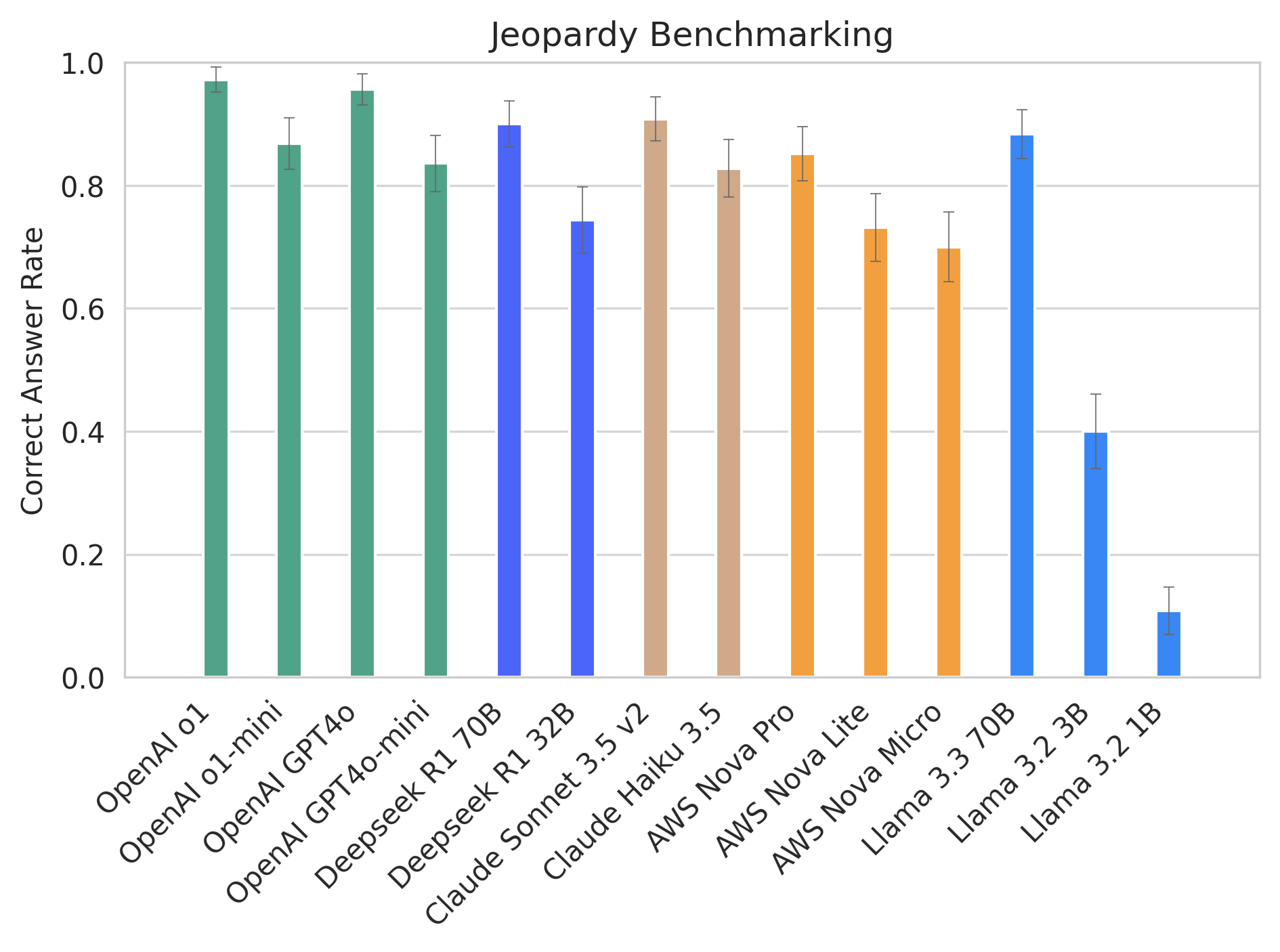 And because I'm using Bedrock and the boto3 Python SDK, switching model is super easy. All I had to do was switch the model Id (sometimes model ARN or model endpoint). While the OpenAI models still lead the performance for the Jeopardy! questions, for different use cases, having the optionality of multiple models from Bedrock can be very helpful.