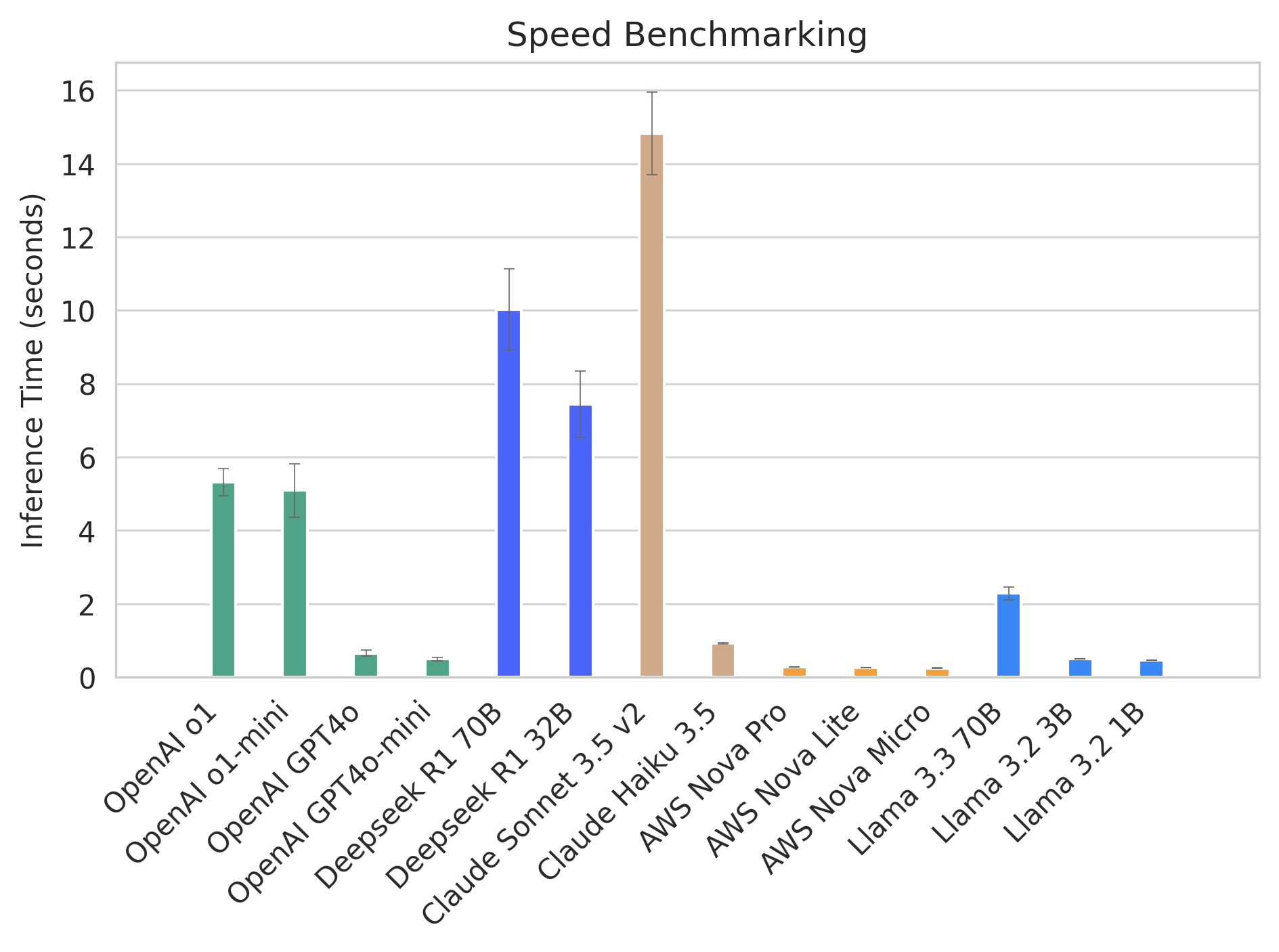 The speed of DeepSeek R1 70B is a bit faster than Claude Sonnet 3.5 v2, while delivering comparably accurate results. The smaller DeepSeek R1 32B is faster, but depending on your use case, the tradeoff might not be worth the speed up.