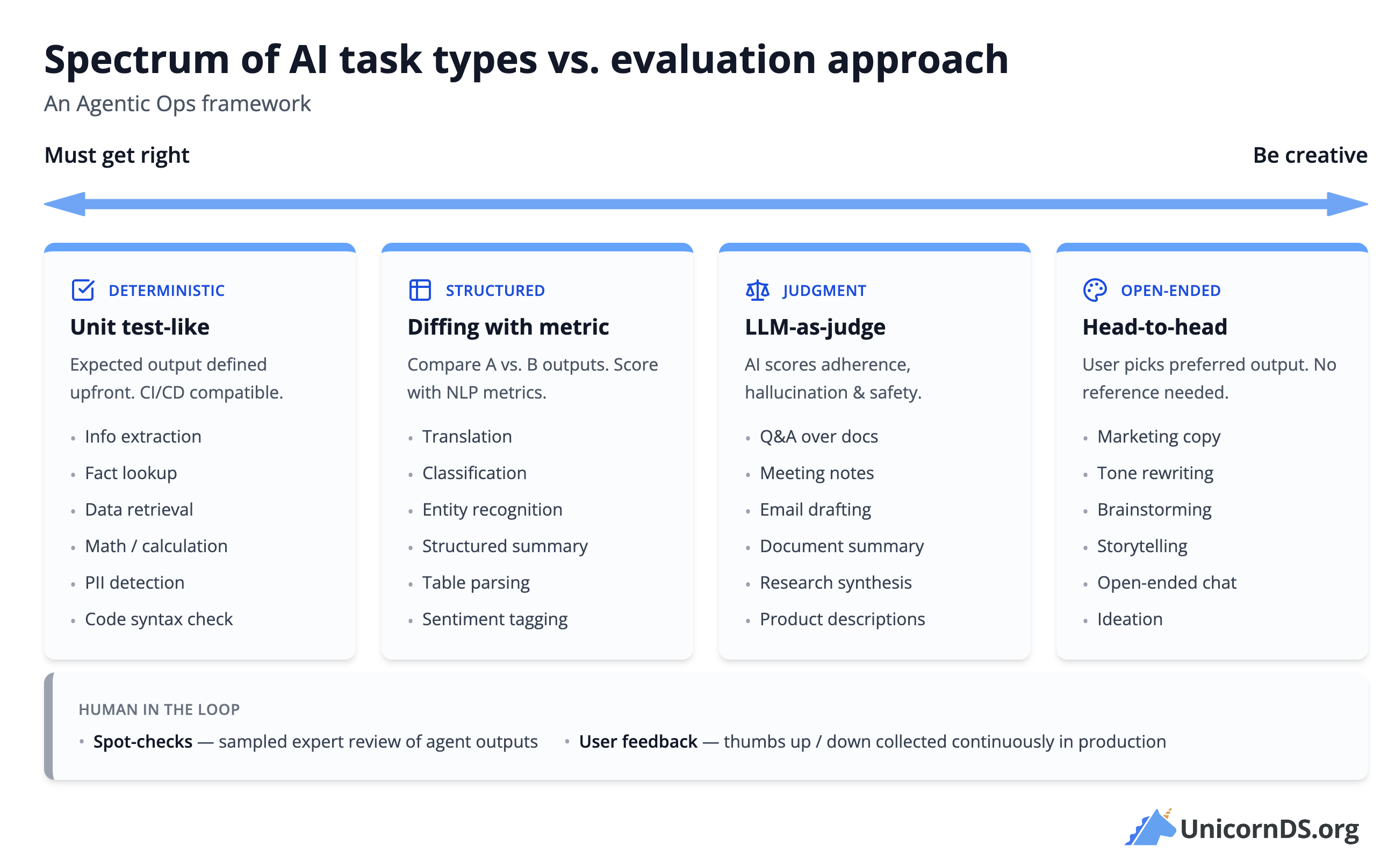 The core of Agentic Ops is agent evaluation, and the key insight is that evaluation method must match task type. Not every agent task can — or should — be evaluated the same way.